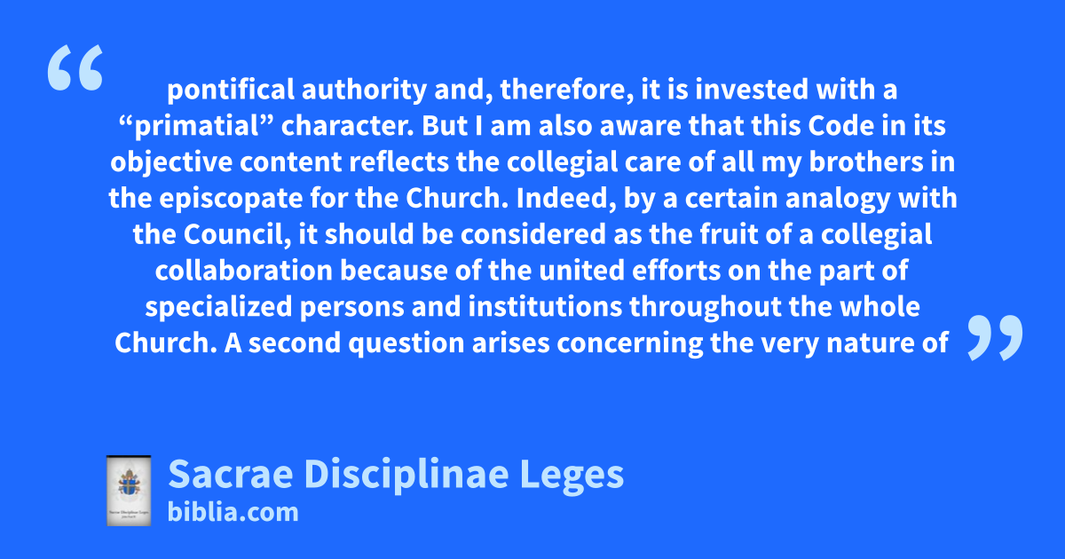 pontifical authority and, therefore, it is invested with a “primatial” character. But I am also aware that this Code in its objective content reflects the collegial care of all my brothers in the episcopate for the Church. Indeed, by a certain analogy with the Council, it should be considered as the fruit of a collegial collaboration because of the united efforts on the part of specialized persons and institutions throughout the whole Church. A second question arises concerning the very nature of