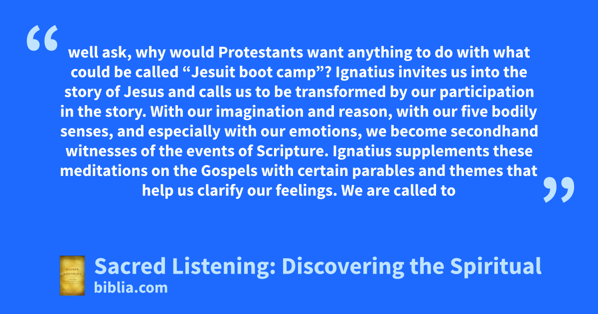well ask, why would Protestants want anything to do with what could be called “Jesuit boot camp”? Ignatius invites us into the story of Jesus and calls us to be transformed by our participation in the story. With our imagination and reason, with our five bodily senses, and especially with our emotions, we become secondhand witnesses of the events of Scripture. Ignatius supplements these meditations on the Gospels with certain parables and themes that help us clarify our feelings. We are called to