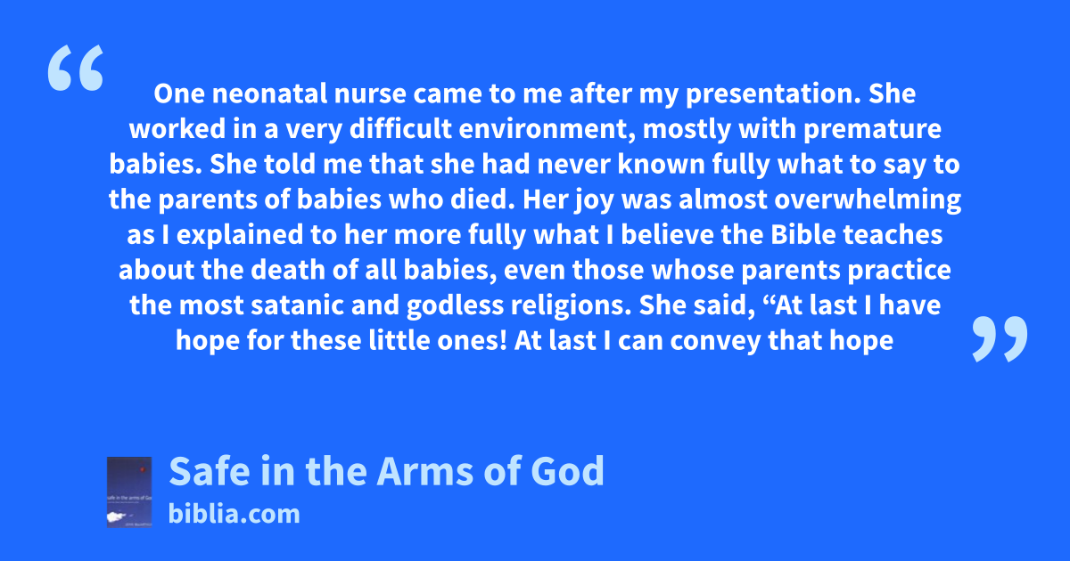 One neonatal nurse came to me after my presentation. She worked in a very difficult environment, mostly with premature babies. She told me that she had never known fully what to say to the parents of babies who died. Her joy was almost overwhelming as I explained to her more fully what I believe the Bible teaches about the death of all babies, even those whose parents practice the most satanic and godless religions. She said, “At last I have hope for these little ones! At last I can convey that hope