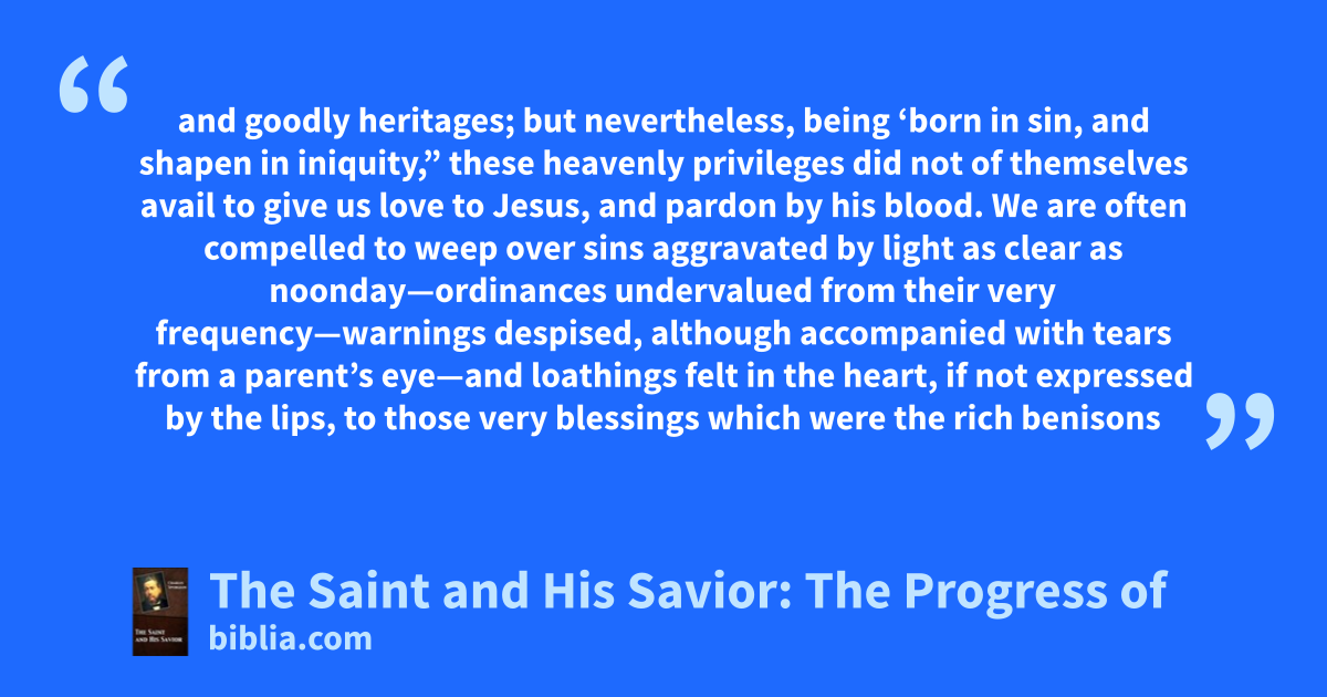 and goodly heritages; but nevertheless, being ‘born in sin, and shapen in iniquity,” these heavenly privileges did not of themselves avail to give us love to Jesus, and pardon by his blood. We are often compelled to weep over sins aggravated by light as clear as noonday—ordinances undervalued from their very frequency—warnings despised, although accompanied with tears from a parent’s eye—and loathings felt in the heart, if not expressed by the lips, to those very blessings which were the rich benisons
