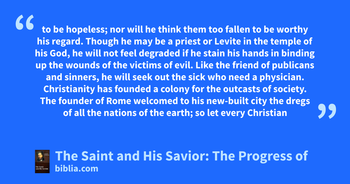 to be hopeless; nor will he think them too fallen to be worthy his regard. Though he may be a priest or Levite in the temple of his God, he will not feel degraded if he stain his hands in binding up the wounds of the victims of evil. Like the friend of publicans and sinners, he will seek out the sick who need a physician. Christianity has founded a colony for the outcasts of society. The founder of Rome welcomed to his new-built city the dregs of all the nations of the earth; so let every Christian