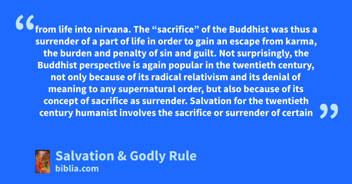 from life into nirvana. The “sacrifice” of the Buddhist was thus a surrender of a part of life in order to gain an escape from karma, the burden and penalty of sin and guilt. Not surprisingly, the Buddhist perspective is again popular in the twentieth century, not only because of its radical relativism and its denial of meaning to any supernatural order, but also because of its concept of sacrifice as surrender. Salvation for the twentieth century humanist involves the sacrifice or surrender of certain