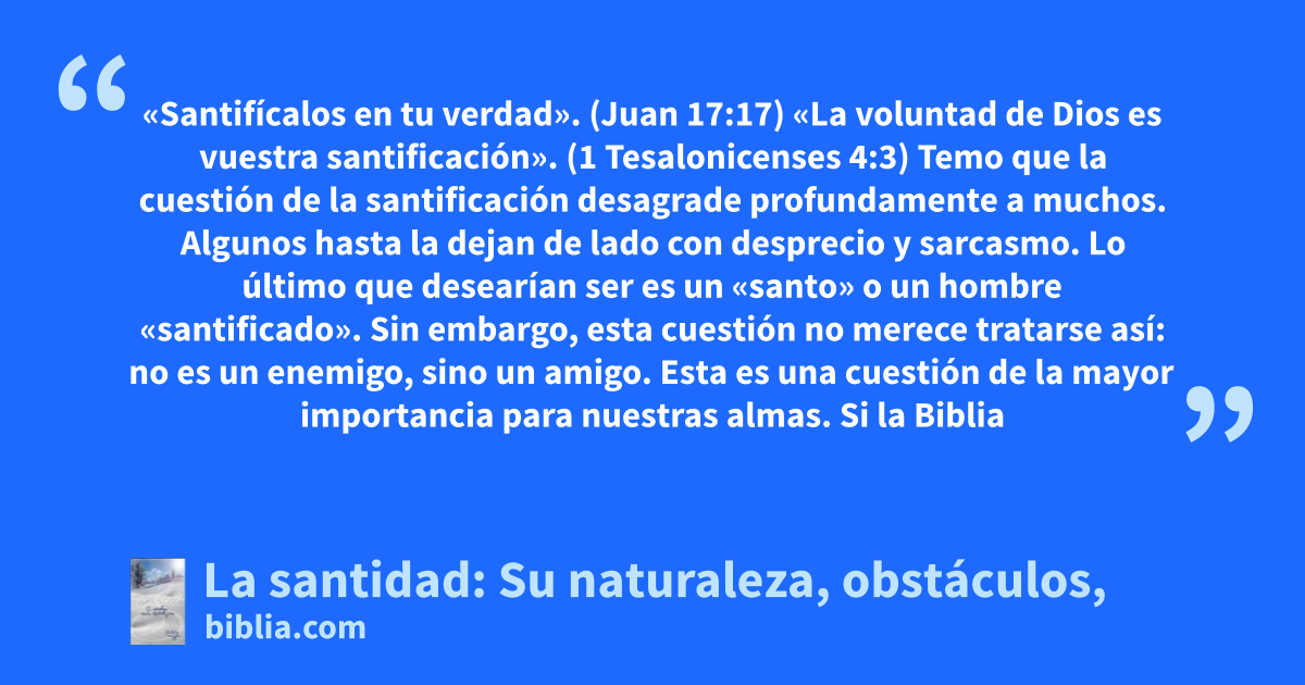 «Santifícalos en tu verdad». (Juan 17:17) «La voluntad de Dios es vuestra santificación». (1 Tesalonicenses 4:3) Temo que la cuestión de la santificación desagrade profundamente a muchos. Algunos hasta la dejan de lado con desprecio y sarcasmo. Lo último que desearían ser es un «santo» o un hombre «santificado». Sin embargo, esta cuestión no merece tratarse así: no es un enemigo, sino un amigo. Esta es una cuestión de la mayor importancia para nuestras almas. Si la Biblia