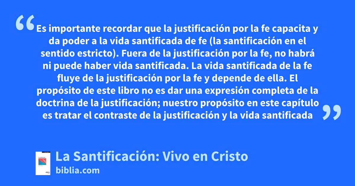 Es importante recordar que la justificación por la fe capacita y da poder a la vida santificada de fe (la santificación en el sentido estricto). Fuera de la justificación por la fe, no habrá ni puede haber vida santificada. La vida santificada de la fe fluye de la justificación por la fe y depende de ella. El propósito de este libro no es dar una expresión completa de la doctrina de la justificación; nuestro propósito en este capítulo es tratar el contraste de la justificación y la vida santificada