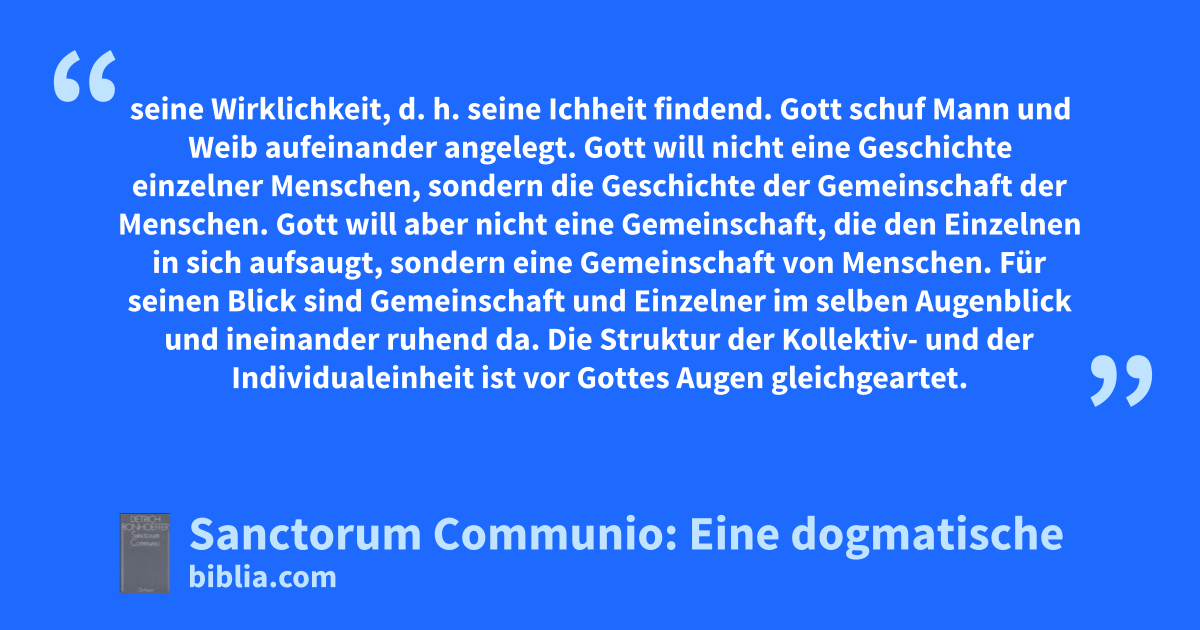 seine Wirklichkeit, d. h. seine Ichheit findend. Gott schuf Mann und Weib aufeinander angelegt. Gott will nicht eine Geschichte einzelner Menschen, sondern die Geschichte der Gemeinschaft der Menschen. Gott will aber nicht eine Gemeinschaft, die den Einzelnen in sich aufsaugt, sondern eine Gemeinschaft von Menschen. Für seinen Blick sind Gemeinschaft und Einzelner im selben Augenblick und ineinander ruhend da. Die Struktur der Kollektiv- und der Individualeinheit ist vor Gottes Augen gleichgeartet.