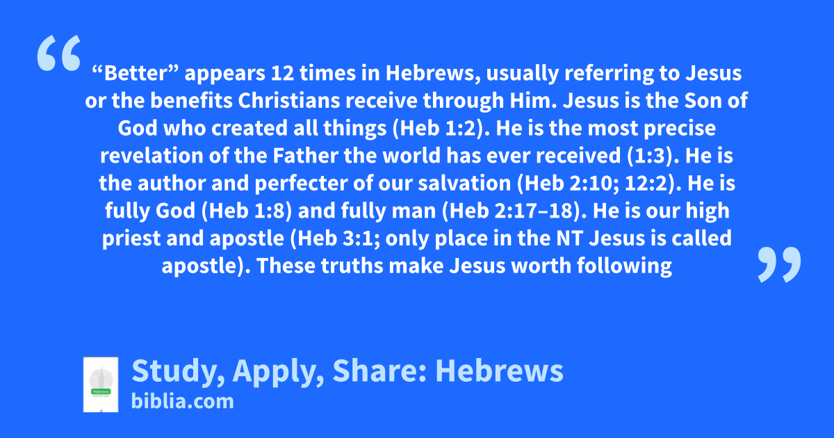 “Better” appears 12 times in Hebrews, usually referring to Jesus or the benefits Christians receive through Him. Jesus is the Son of God who created all things (Heb 1:2). He is the most precise revelation of the Father the world has ever received (1:3). He is the author and perfecter of our salvation (Heb 2:10; 12:2). He is fully God (Heb 1:8) and fully man (Heb 2:17–18). He is our high priest and apostle (Heb 3:1; only place in the NT Jesus is called apostle). These truths make Jesus worth following