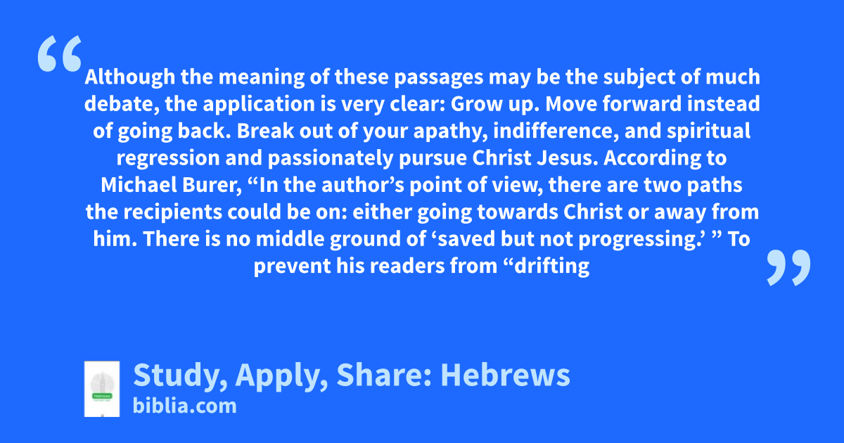 Although the meaning of these passages may be the subject of much debate, the application is very clear: Grow up. Move forward instead of going back. Break out of your apathy, indifference, and spiritual regression and passionately pursue Christ Jesus. According to Michael Burer, “In the author’s point of view, there are two paths the recipients could be on: either going towards Christ or away from him. There is no middle ground of ‘saved but not progressing.’ ” To prevent his readers from “drifting