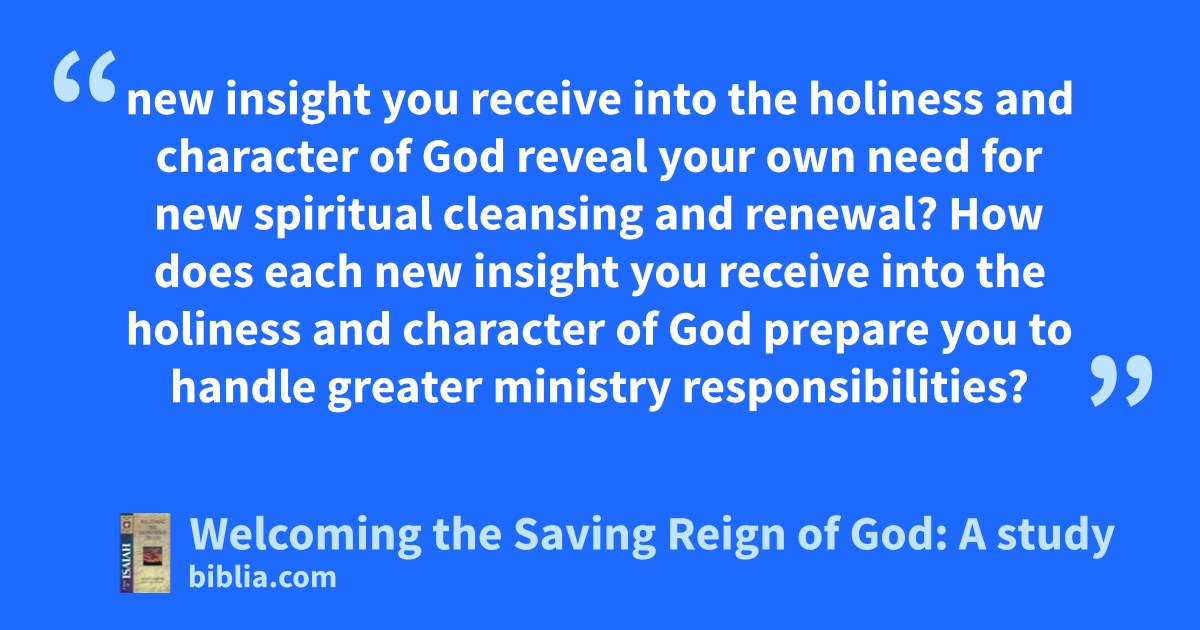 new insight you receive into the holiness and character of God reveal your own need for new spiritual cleansing and renewal? How does each new insight you receive into the holiness and character of God prepare you to handle greater ministry responsibilities?