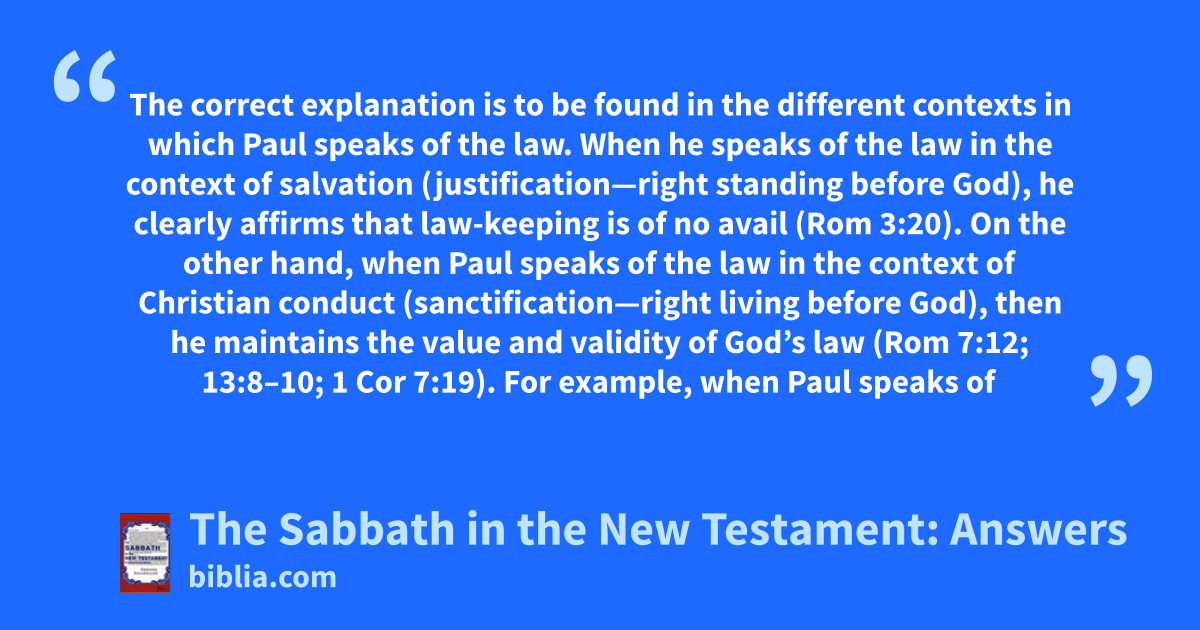 The correct explanation is to be found in the different contexts in which Paul speaks of the law. When he speaks of the law in the context of salvation (justification—right standing before God), he clearly affirms that law-keeping is of no avail (Rom 3:20). On the other hand, when Paul speaks of the law in the context of Christian conduct (sanctification—right living before God), then he maintains the value and validity of God’s law (Rom 7:12; 13:8–10; 1 Cor 7:19). For example, when Paul speaks of