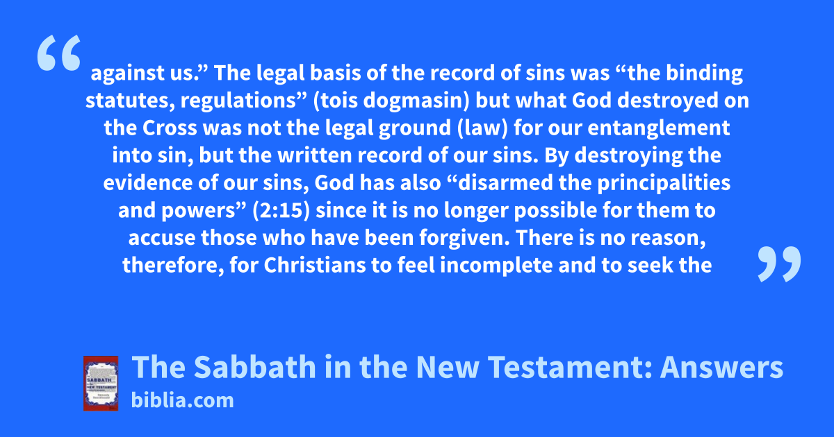 against us.” The legal basis of the record of sins was “the binding statutes, regulations” (tois dogmasin) but what God destroyed on the Cross was not the legal ground (law) for our entanglement into sin, but the written record of our sins. By destroying the evidence of our sins, God has also “disarmed the principalities and powers” (2:15) since it is no longer possible for them to accuse those who have been forgiven. There is no reason, therefore, for Christians to feel incomplete and to seek the