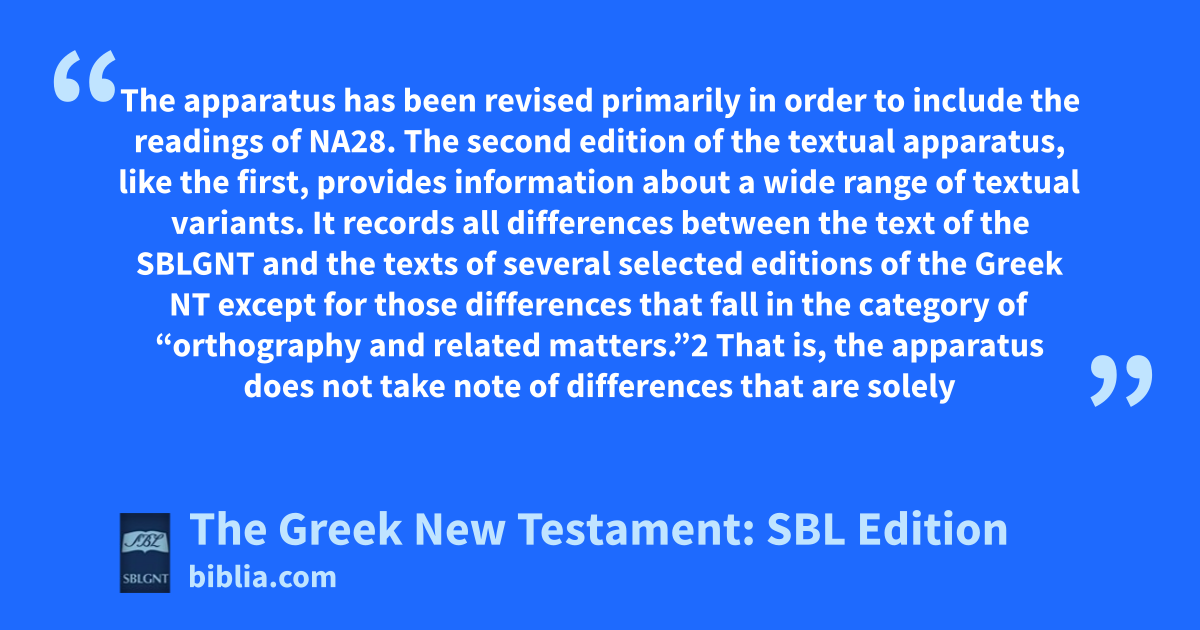 The apparatus has been revised primarily in order to include the readings of NA28. The second edition of the textual apparatus, like the first, provides information about a wide range of textual variants. It records all differences between the text of the SBLGNT and the texts of several selected editions of the Greek NT except for those differences that fall in the category of “orthography and related matters.”2 That is, the apparatus does not take note of differences that are solely a matter of orthographic variation or that involve only elision, crasis, movable ν, interchange between first and second aorist verb endings, and the like. It does record all other differences between the SBL text and the texts of the editions listed below, of which there are now 6,934.3 The following editions are cited for every variation unit: