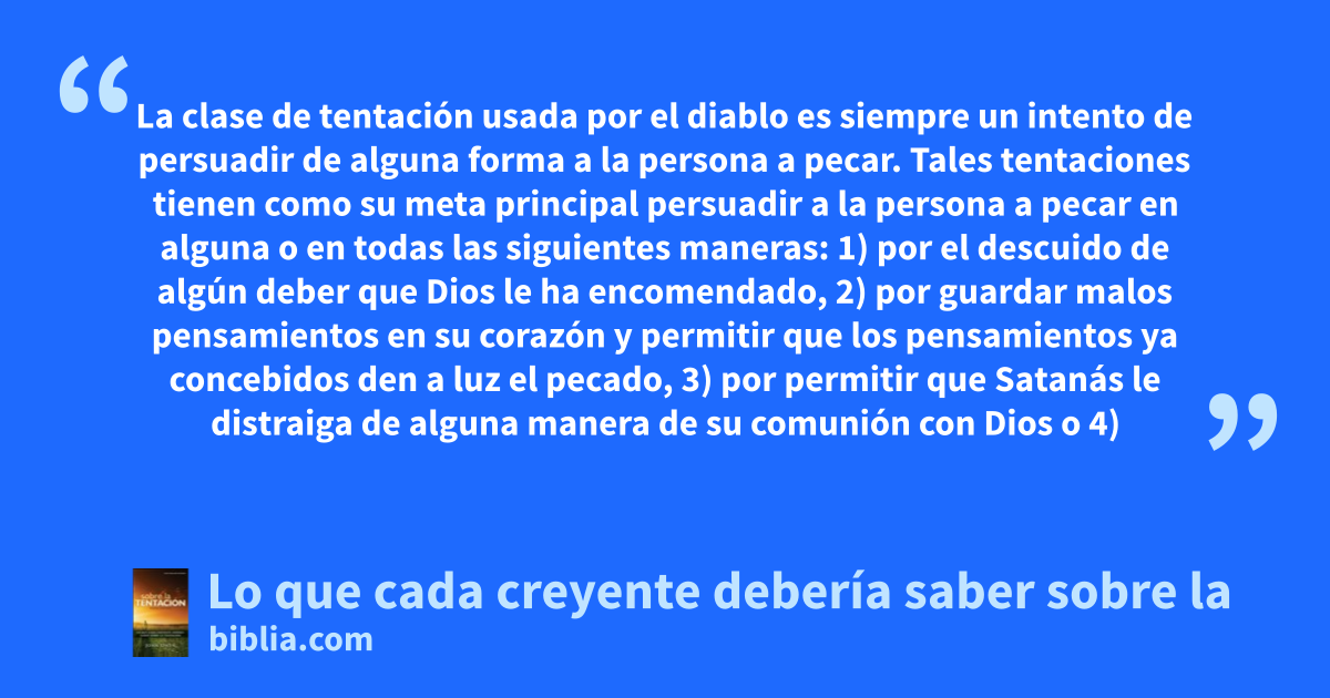La clase de tentación usada por el diablo es siempre un intento de persuadir de alguna forma a la persona a pecar. Tales tentaciones tienen como su meta principal persuadir a la persona a pecar en alguna o en todas las siguientes maneras: 1) por el descuido de algún deber que Dios le ha encomendado, 2) por guardar malos pensamientos en su corazón y permitir que los pensamientos ya concebidos den a luz el pecado, 3) por permitir que Satanás le distraiga de alguna manera de su comunión con Dios o 4)