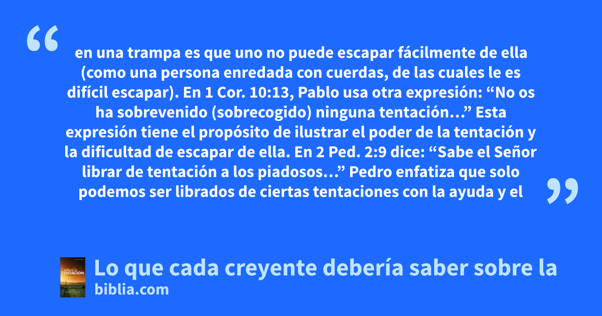 en una trampa es que uno no puede escapar fácilmente de ella (como una persona enredada con cuerdas, de las cuales le es difícil escapar). En 1 Cor. 10:13, Pablo usa otra expresión: “No os ha sobrevenido (sobrecogido) ninguna tentación…” Esta expresión tiene el propósito de ilustrar el poder de la tentación y la dificultad de escapar de ella. En 2 Ped. 2:9 dice: “Sabe el Señor librar de tentación a los piadosos…” Pedro enfatiza que solo podemos ser librados de ciertas tentaciones con la ayuda y el