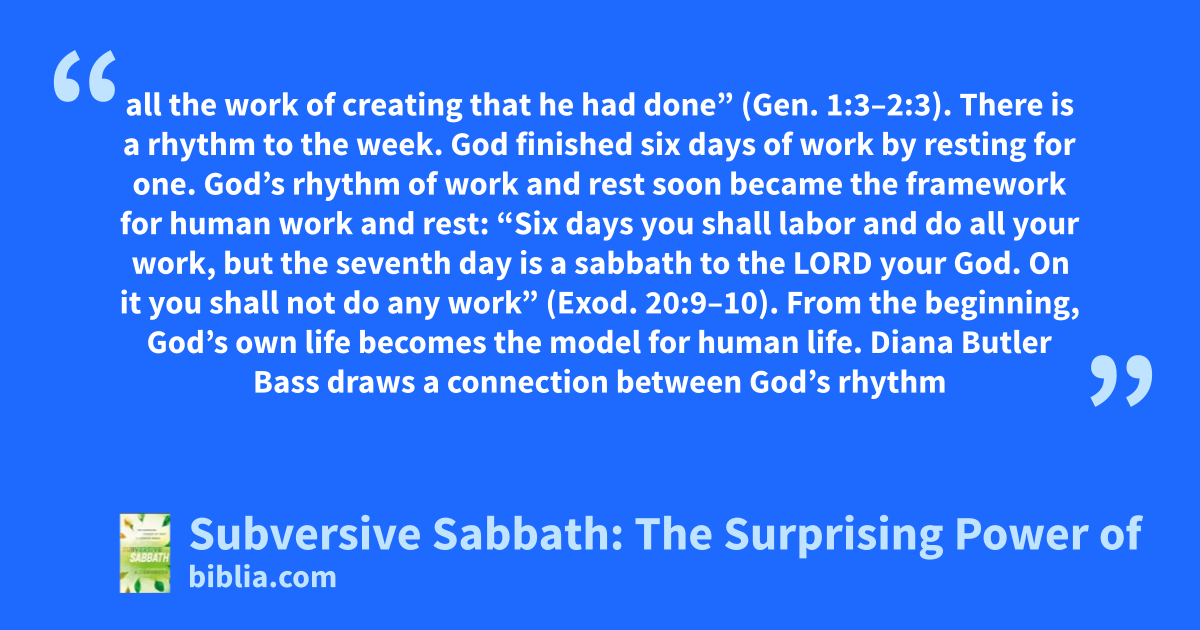 all the work of creating that he had done” (Gen. 1:3–2:3). There is a rhythm to the week. God finished six days of work by resting for one. God’s rhythm of work and rest soon became the framework for human work and rest: “Six days you shall labor and do all your work, but the seventh day is a sabbath to the LORD your God. On it you shall not do any work” (Exod. 20:9–10). From the beginning, God’s own life becomes the model for human life. Diana Butler Bass draws a connection between God’s rhythm