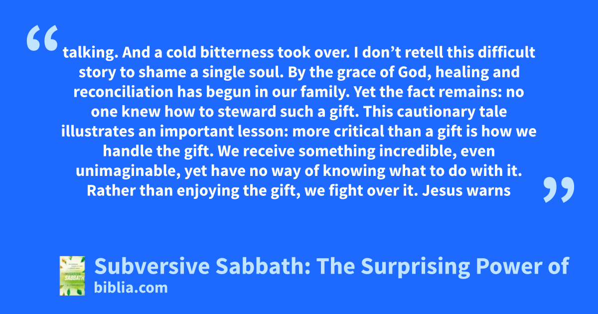 talking. And a cold bitterness took over. I don’t retell this difficult story to shame a single soul. By the grace of God, healing and reconciliation has begun in our family. Yet the fact remains: no one knew how to steward such a gift. This cautionary tale illustrates an important lesson: more critical than a gift is how we handle the gift. We receive something incredible, even unimaginable, yet have no way of knowing what to do with it. Rather than enjoying the gift, we fight over it. Jesus warns