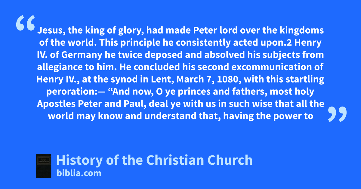 Jesus, the king of glory, had made Peter lord over the kingdoms of the world. This principle he consistently acted upon.2 Henry IV. of Germany he twice deposed and absolved his subjects from allegiance to him. He concluded his second excommunication of Henry IV., at the synod in Lent, March 7, 1080, with this startling peroration:— “And now, O ye princes and fathers, most holy Apostles Peter and Paul, deal ye with us in such wise that all the world may know and understand that, having the power to