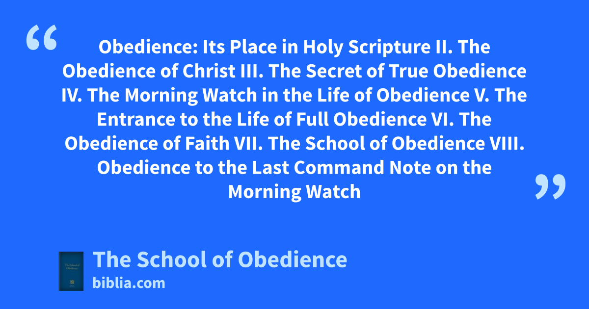 Obedience: Its Place in Holy Scripture II. The Obedience of Christ III. The Secret of True Obedience IV. The Morning Watch in the Life of Obedience V. The Entrance to the Life of Full Obedience VI. The Obedience of Faith VII. The School of Obedience VIII. Obedience to the Last Command Note on the Morning Watch
