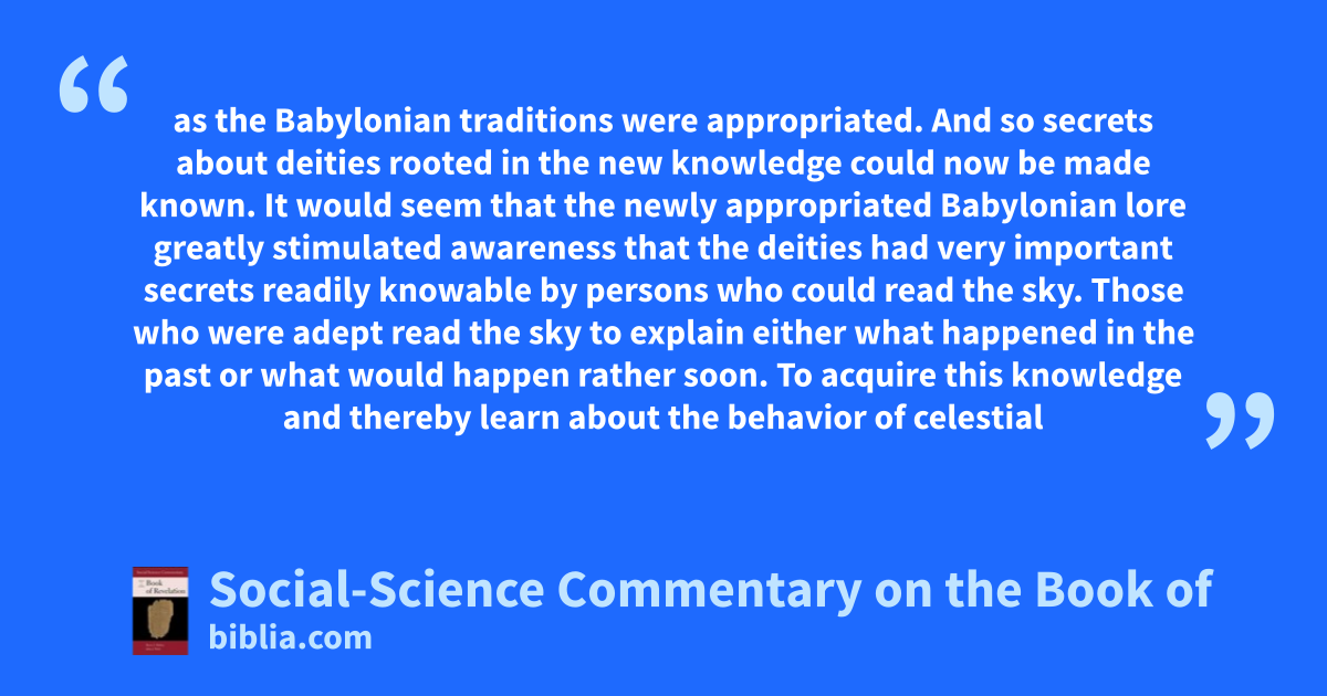 as the Babylonian traditions were appropriated. And so secrets about deities rooted in the new knowledge could now be made known. It would seem that the newly appropriated Babylonian lore greatly stimulated awareness that the deities had very important secrets readily knowable by persons who could read the sky. Those who were adept read the sky to explain either what happened in the past or what would happen rather soon. To acquire this knowledge and thereby learn about the behavior of celestial