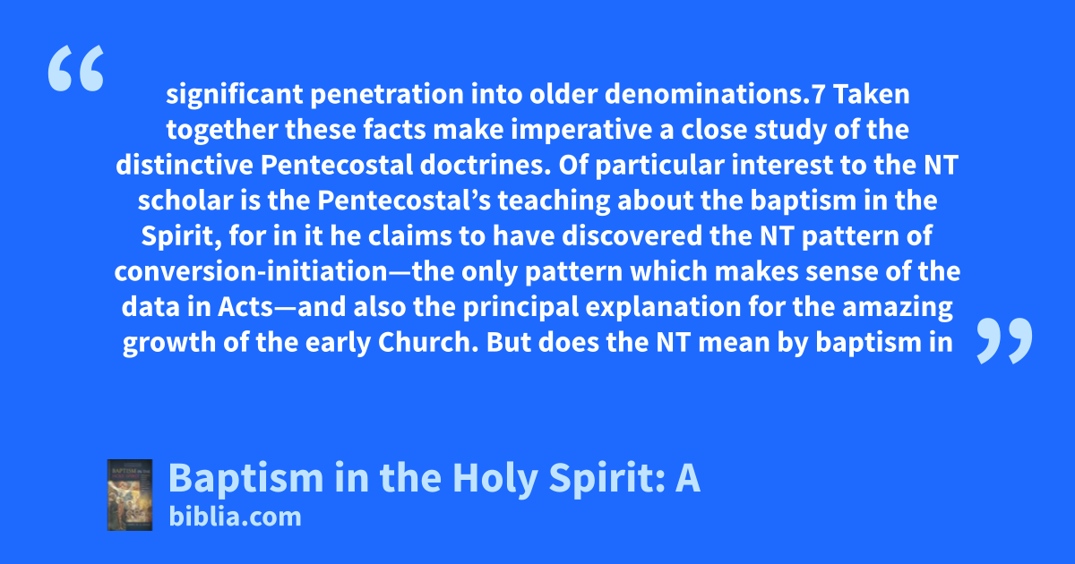 significant penetration into older denominations.7 Taken together these facts make imperative a close study of the distinctive Pentecostal doctrines. Of particular interest to the NT scholar is the Pentecostal’s teaching about the baptism in the Spirit, for in it he claims to have discovered the NT pattern of conversion-initiation—the only pattern which makes sense of the data in Acts—and also the principal explanation for the amazing growth of the early Church. But does the NT mean by baptism in