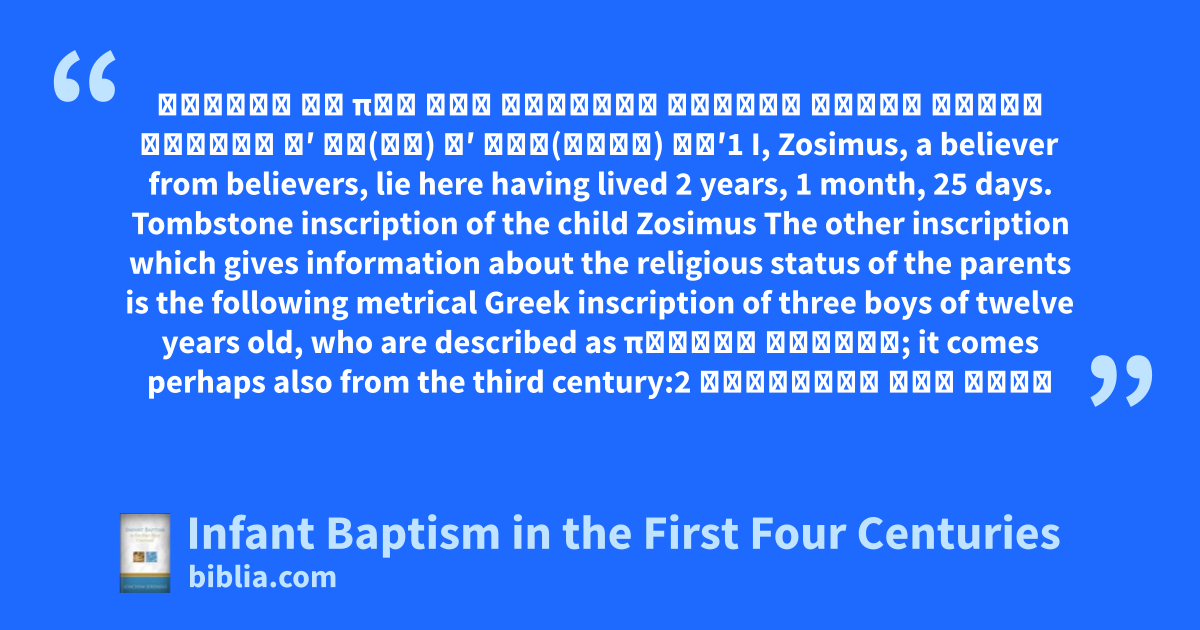 Πιστὸς ἐκ πις τῶν Ζώσιμος ἐνθάδε κεῖμε ζήσας ἔτεσιν βʹ μη(νὶ) αʹ ἡμέ(ραις) κεʹ1 I, Zosimus, a believer from believers, lie here having lived 2 years, 1 month, 25 days. Tombstone inscription of the child Zosimus The other inscription which gives information about the religious status of the parents is the following metrical Greek inscription of three boys of twelve years old, who are described as πιστοὶ γενετῇ; it comes perhaps also from the third century:2 Ἀλκινόων δύο σῆμα
