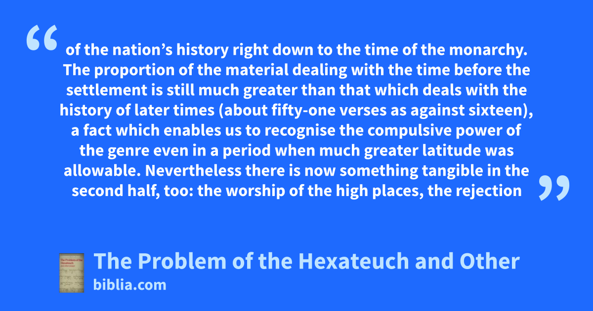 of the nation’s history right down to the time of the monarchy. The proportion of the material dealing with the time before the settlement is still much greater than that which deals with the history of later times (about fifty-one verses as against sixteen), a fact which enables us to recognise the compulsive power of the genre even in a period when much greater latitude was allowable. Nevertheless there is now something tangible in the second half, too: the worship of the high places, the rejection