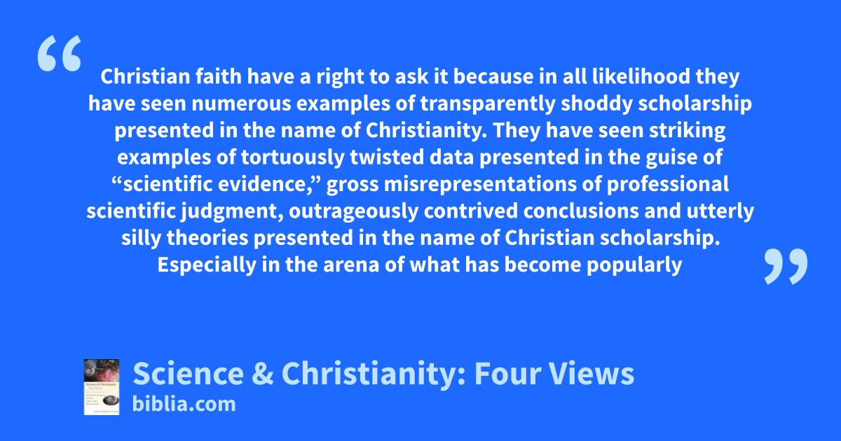 Christian faith have a right to ask it because in all likelihood they have seen numerous examples of transparently shoddy scholarship presented in the name of Christianity. They have seen striking examples of tortuously twisted data presented in the guise of “scientific evidence,” gross misrepresentations of professional scientific judgment, outrageously contrived conclusions and utterly silly theories presented in the name of Christian scholarship. Especially in the arena of what has become popularly