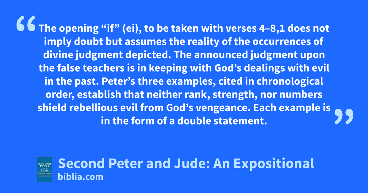 The opening “if” (ei), to be taken with verses 4–8,1 does not imply doubt but assumes the reality of the occurrences of divine judgment depicted. The announced judgment upon the false teachers is in keeping with God’s dealings with evil in the past. Peter’s three examples, cited in chronological order, establish that neither rank, strength, nor numbers shield rebellious evil from God’s vengeance. Each example is in the form of a double statement.