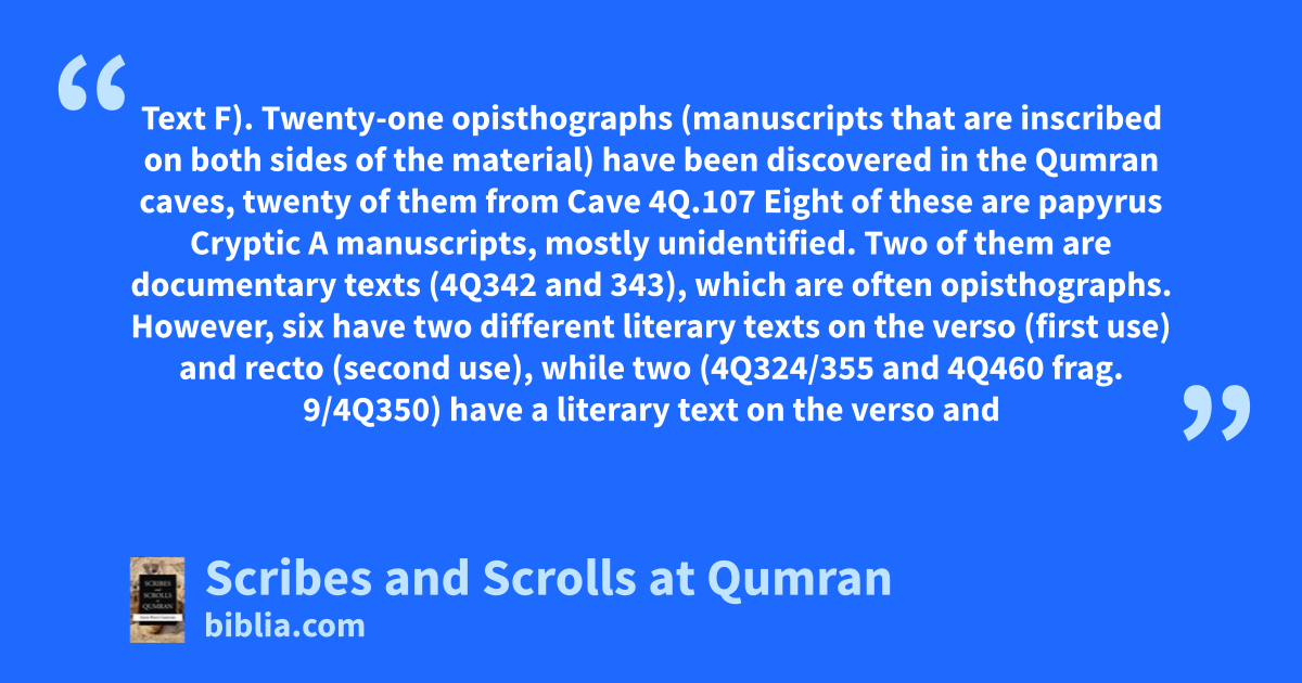 Text F). Twenty-one opisthographs (manuscripts that are inscribed on both sides of the material) have been discovered in the Qumran caves, twenty of them from Cave 4Q.107 Eight of these are papyrus Cryptic A manuscripts, mostly unidentified. Two of them are documentary texts (4Q342 and 343), which are often opisthographs. However, six have two different literary texts on the verso (first use) and recto (second use), while two (4Q324/355 and 4Q460 frag. 9/4Q350) have a literary text on the verso and