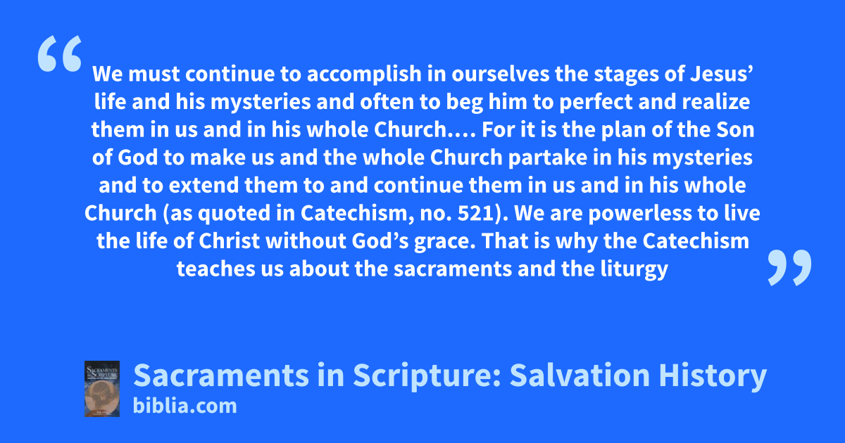We must continue to accomplish in ourselves the stages of Jesus’ life and his mysteries and often to beg him to perfect and realize them in us and in his whole Church.… For it is the plan of the Son of God to make us and the whole Church partake in his mysteries and to extend them to and continue them in us and in his whole Church (as quoted in Catechism, no. 521). We are powerless to live the life of Christ without God’s grace. That is why the Catechism teaches us about the sacraments and the liturgy