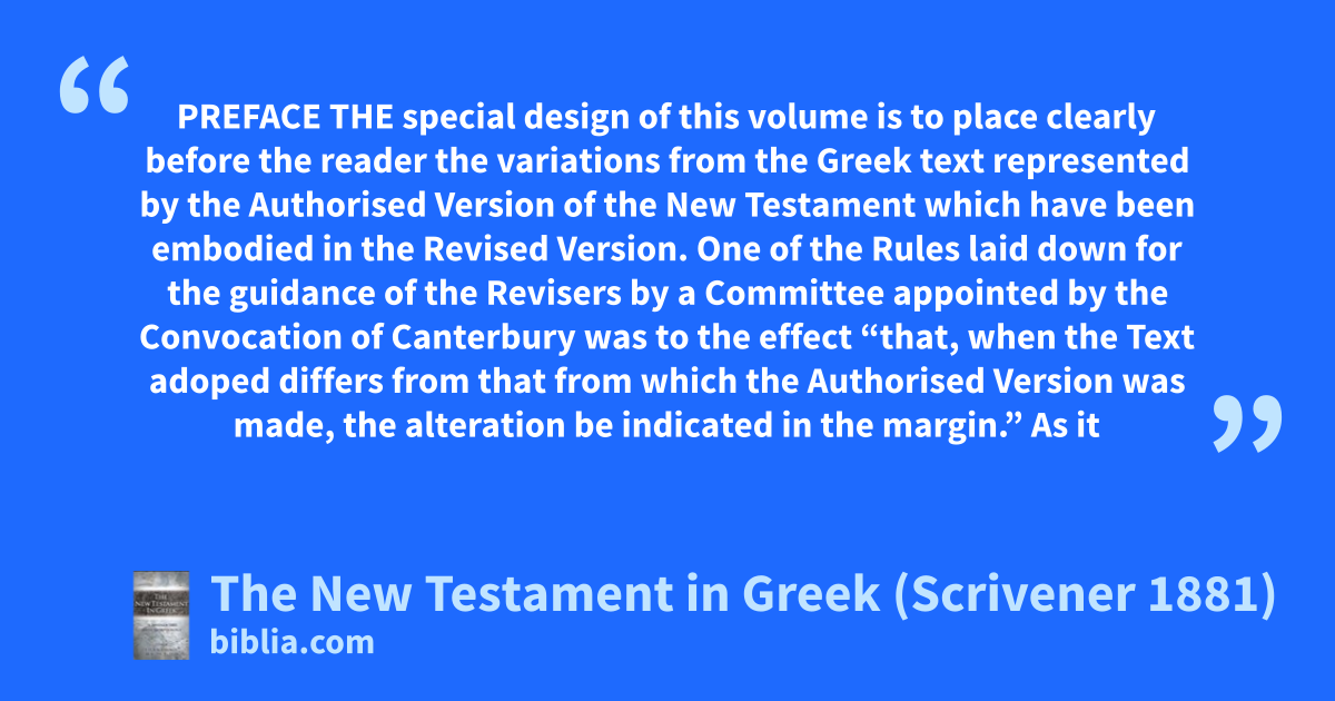 The form here chosen has been thought by the Syndics of the Cambridge University Press to be at once the most convenient in itself, and the best fitted for giving a true representation of the Revisers’ work. In their Preface the Revisers explain that it did not fall within their province to construct a continuous and complete Greek text. Wherever a variation in the Greek was of such a nature that it could properly affect the English rendering, they had to decide between the competing readings: but in most other cases they refrained from spending time on work not needed for the purposes of an English translation. It was therefore impossible to print a continuous Greek text which should include the readings certified as adopted by the Revisers, without borrowing all the intervening portions from some printed text which had not undergone their revision, and in which, to judge by analogy, they would doubtless have found many readings to disapprove. It is true that all variations in this unrevised part of the text must from the nature of the case be comparatively unimportant: but they include many differences of order and grammatical form expressive of shades and modifications of meaning which no careful reader would neglect in studying the Greek original. The Cambridge Press has therefore judged it best to set the readings actually adopted by the Revisers at the foot of the page, and to keep the continuous text consistent throughout by making it so far as was possible uniformly representative of the Authorised Version. The publication of an edition formed on this plan appeared to be all the more desirable, inasmuch as the Authorised Version was not a translation of any one Greek text then in existence, and no Greek text intended to reporduce in any way the original of the Authorised Version has ever been printed.
