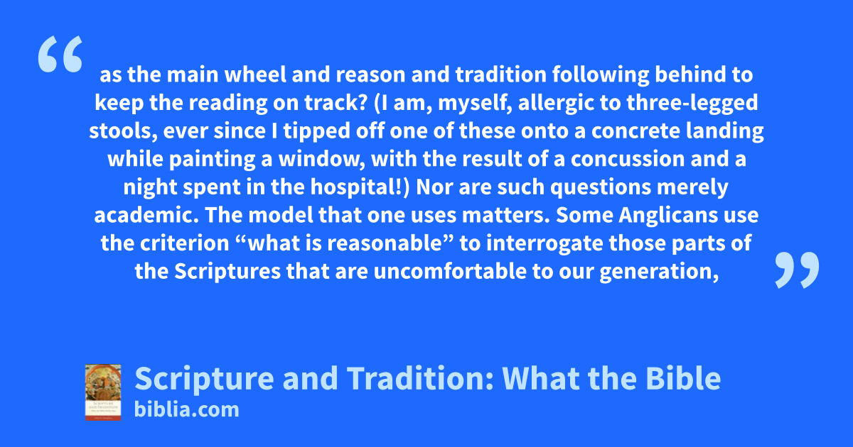 as the main wheel and reason and tradition following behind to keep the reading on track? (I am, myself, allergic to three-legged stools, ever since I tipped off one of these onto a concrete landing while painting a window, with the result of a concussion and a night spent in the hospital!) Nor are such questions merely academic. The model that one uses matters. Some Anglicans use the criterion “what is reasonable” to interrogate those parts of the Scriptures that are uncomfortable to our generation,