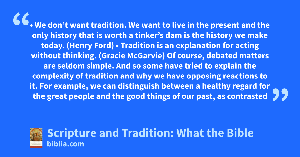 • We don’t want tradition. We want to live in the present and the only history that is worth a tinker’s dam is the history we make today. (Henry Ford) • Tradition is an explanation for acting without thinking. (Gracie McGarvie) Of course, debated matters are seldom simple. And so some have tried to explain the complexity of tradition and why we have opposing reactions to it. For example, we can distinguish between a healthy regard for the great people and the good things of our past, as contrasted