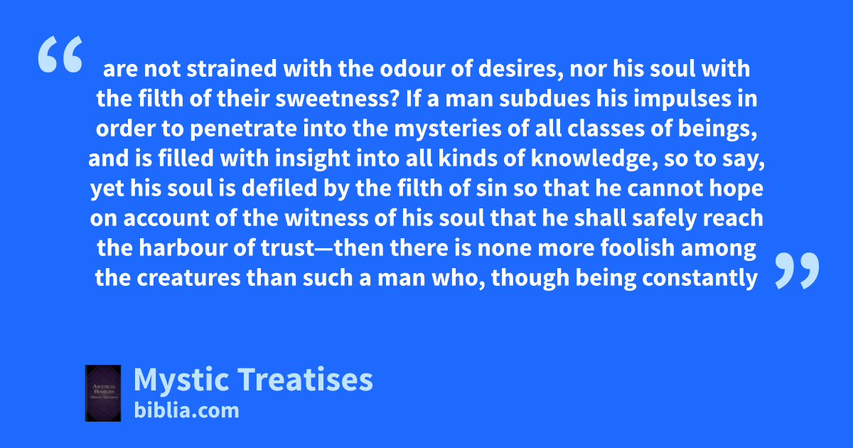 are not strained with the odour of desires, nor his soul with the filth of their sweetness? If a man subdues his impulses in order to penetrate into the mysteries of all classes of beings, and is filled with insight into all kinds of knowledge, so to say, yet his soul is defiled by the filth of sin so that he cannot hope on account of the witness of his soul that he shall safely reach the harbour of trust—then there is none more foolish among the creatures than such a man who, though being constantly