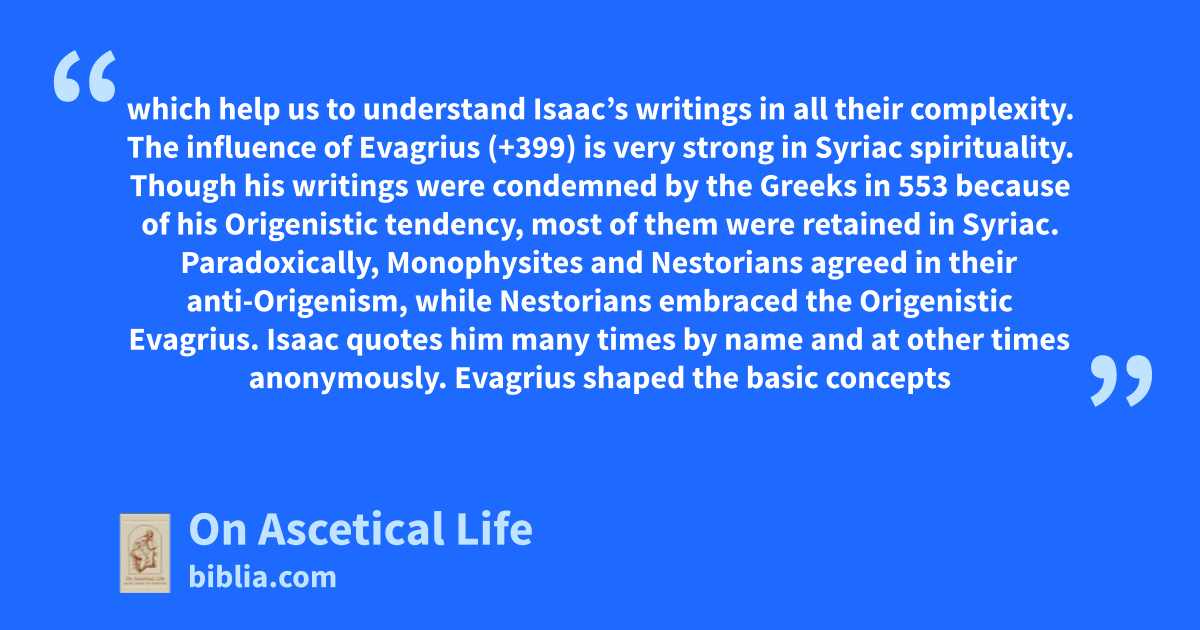which help us to understand Isaac’s writings in all their complexity. The influence of Evagrius (+399) is very strong in Syriac spirituality. Though his writings were condemned by the Greeks in 553 because of his Origenistic tendency, most of them were retained in Syriac. Paradoxically, Monophysites and Nestorians agreed in their anti-Origenism, while Nestorians embraced the Origenistic Evagrius. Isaac quotes him many times by name and at other times anonymously. Evagrius shaped the basic concepts