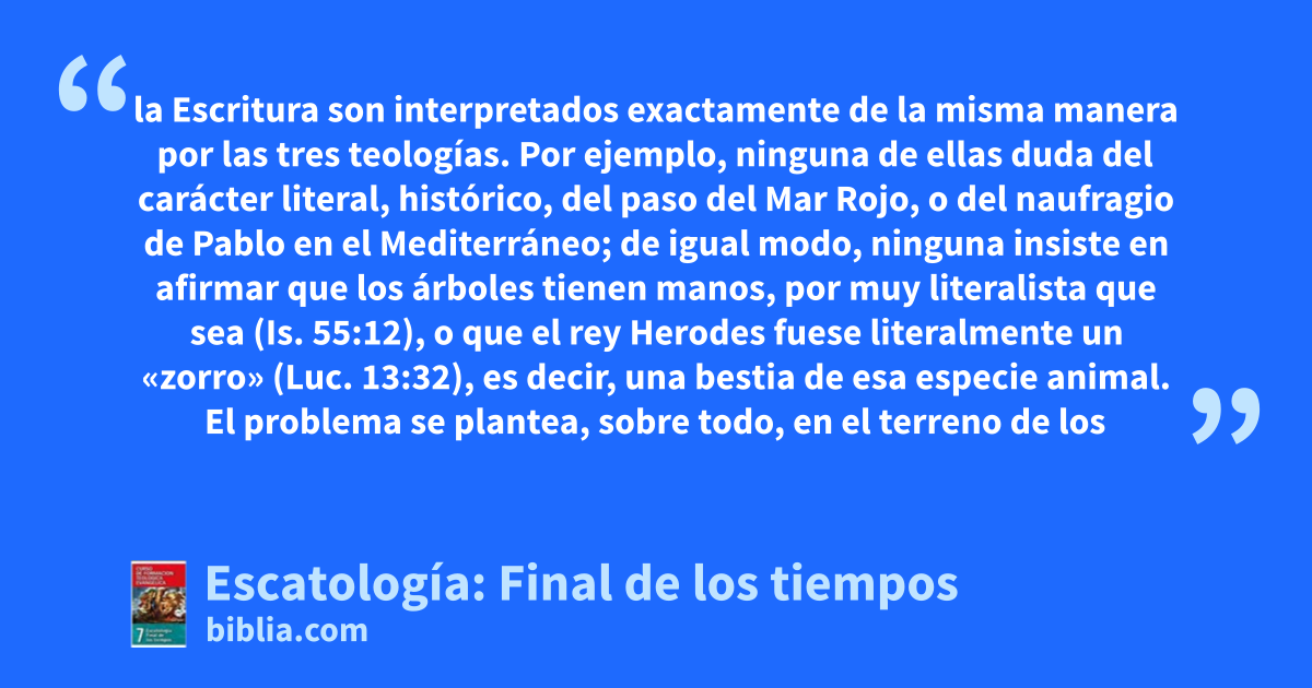 la Escritura son interpretados exactamente de la misma manera por las tres teologías. Por ejemplo, ninguna de ellas duda del carácter literal, histórico, del paso del Mar Rojo, o del naufragio de Pablo en el Mediterráneo; de igual modo, ninguna insiste en afirmar que los árboles tienen manos, por muy literalista que sea (Is. 55:12), o que el rey Herodes fuese literalmente un «zorro» (Luc. 13:32), es decir, una bestia de esa especie animal. El problema se plantea, sobre todo, en el terreno de los