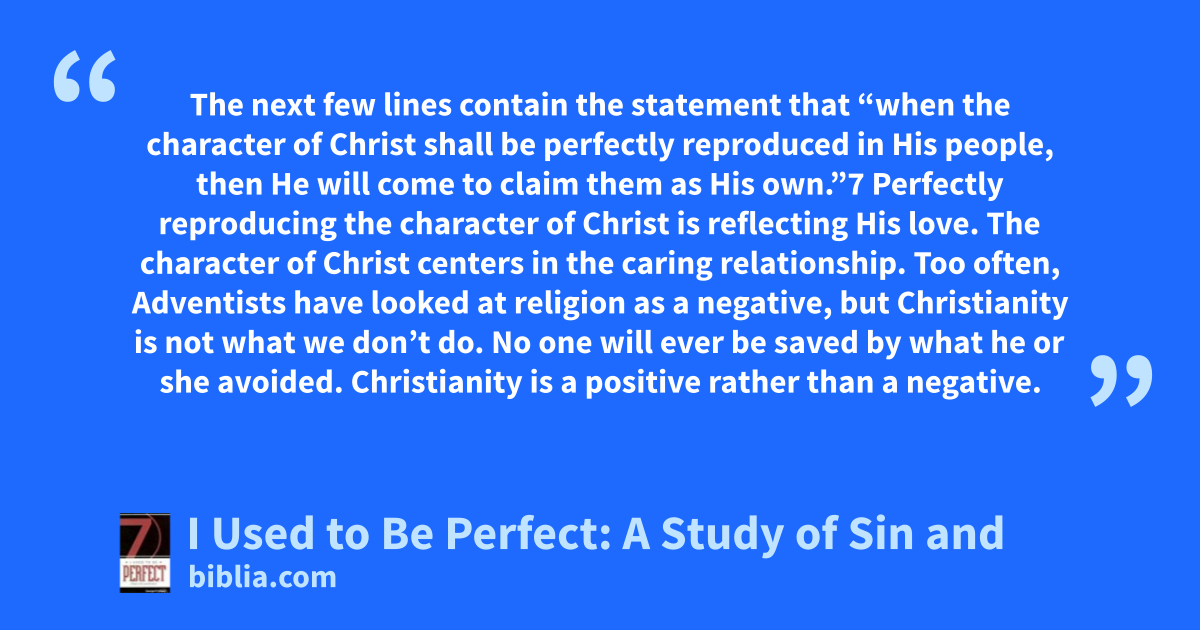 The next few lines contain the statement that “when the character of Christ shall be perfectly reproduced in His people, then He will come to claim them as His own.”7 Perfectly reproducing the character of Christ is reflecting His love. The character of Christ centers in the caring relationship. Too often, Adventists have looked at religion as a negative, but Christianity is not what we don’t do. No one will ever be saved by what he or she avoided. Christianity is a positive rather than a negative.