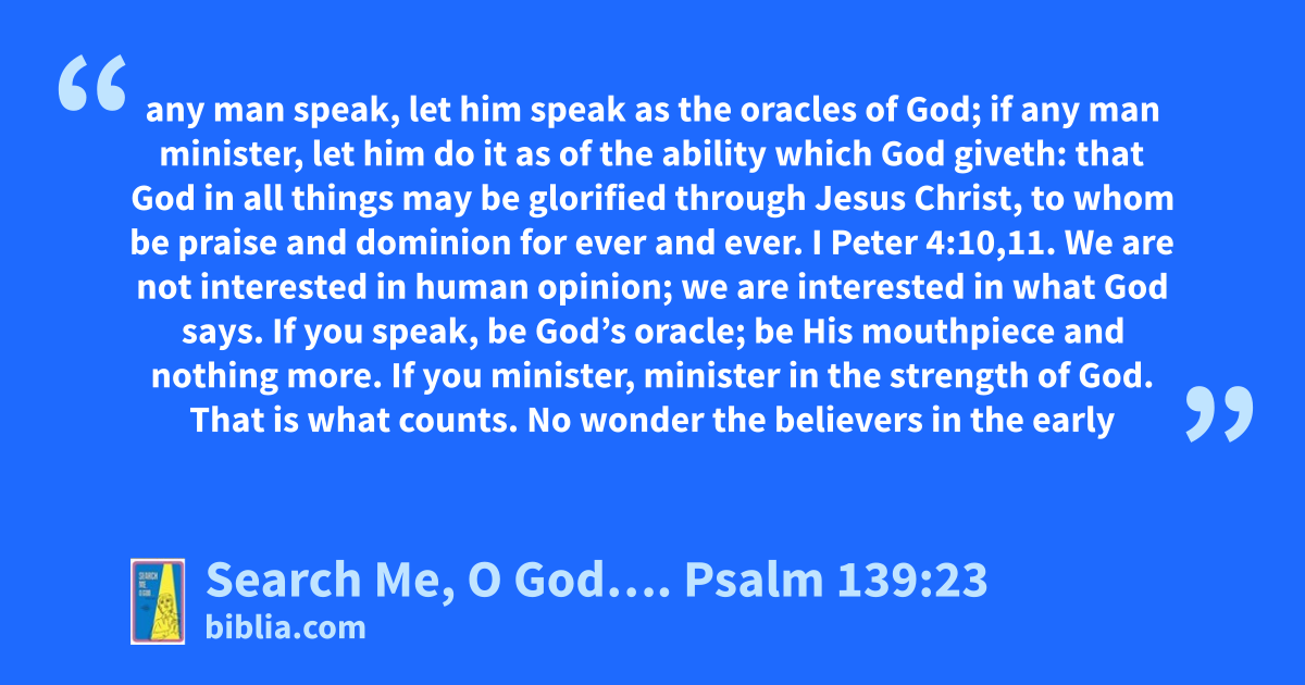 any man speak, let him speak as the oracles of God; if any man minister, let him do it as of the ability which God giveth: that God in all things may be glorified through Jesus Christ, to whom be praise and dominion for ever and ever. I Peter 4:10,11. We are not interested in human opinion; we are interested in what God says. If you speak, be God’s oracle; be His mouthpiece and nothing more. If you minister, minister in the strength of God. That is what counts. No wonder the believers in the early