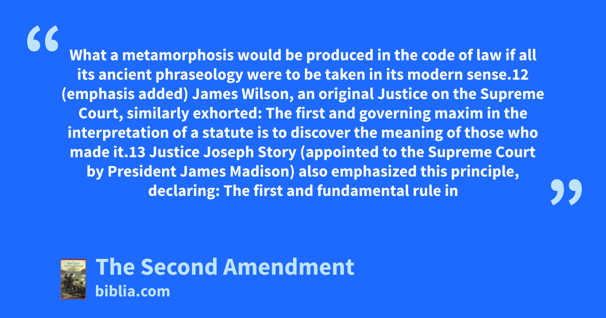 What a metamorphosis would be produced in the code of law if all its ancient phraseology were to be taken in its modern sense.12 (emphasis added) James Wilson, an original Justice on the Supreme Court, similarly exhorted: The first and governing maxim in the interpretation of a statute is to discover the meaning of those who made it.13 Justice Joseph Story (appointed to the Supreme Court by President James Madison) also emphasized this principle, declaring: The first and fundamental rule in