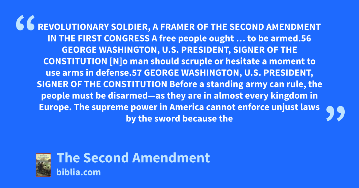 REVOLUTIONARY SOLDIER, A FRAMER OF THE SECOND AMENDMENT IN THE FIRST CONGRESS A free people ought … to be armed.56 GEORGE WASHINGTON, U.S. PRESIDENT, SIGNER OF THE CONSTITUTION [N]o man should scruple or hesitate a moment to use arms in defense.57 GEORGE WASHINGTON, U.S. PRESIDENT, SIGNER OF THE CONSTITUTION Before a standing army can rule, the people must be disarmed—as they are in almost every kingdom in Europe. The supreme power in America cannot enforce unjust laws by the sword because the