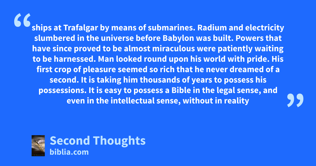 ships at Trafalgar by means of submarines. Radium and electricity slumbered in the universe before Babylon was built. Powers that have since proved to be almost miraculous were patiently waiting to be harnessed. Man looked round upon his world with pride. His first crop of pleasure seemed so rich that he never dreamed of a second. It is taking him thousands of years to possess his possessions. It is easy to possess a Bible in the legal sense, and even in the intellectual sense, without in reality