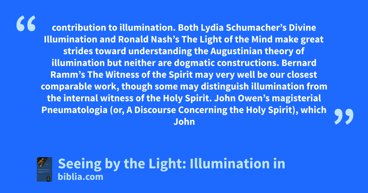 contribution to illumination. Both Lydia Schumacher’s Divine Illumination and Ronald Nash’s The Light of the Mind make great strides toward understanding the Augustinian theory of illumination but neither are dogmatic constructions. Bernard Ramm’s The Witness of the Spirit may very well be our closest comparable work, though some may distinguish illumination from the internal witness of the Holy Spirit. John Owen’s magisterial Pneumatologia (or, A Discourse Concerning the Holy Spirit), which John