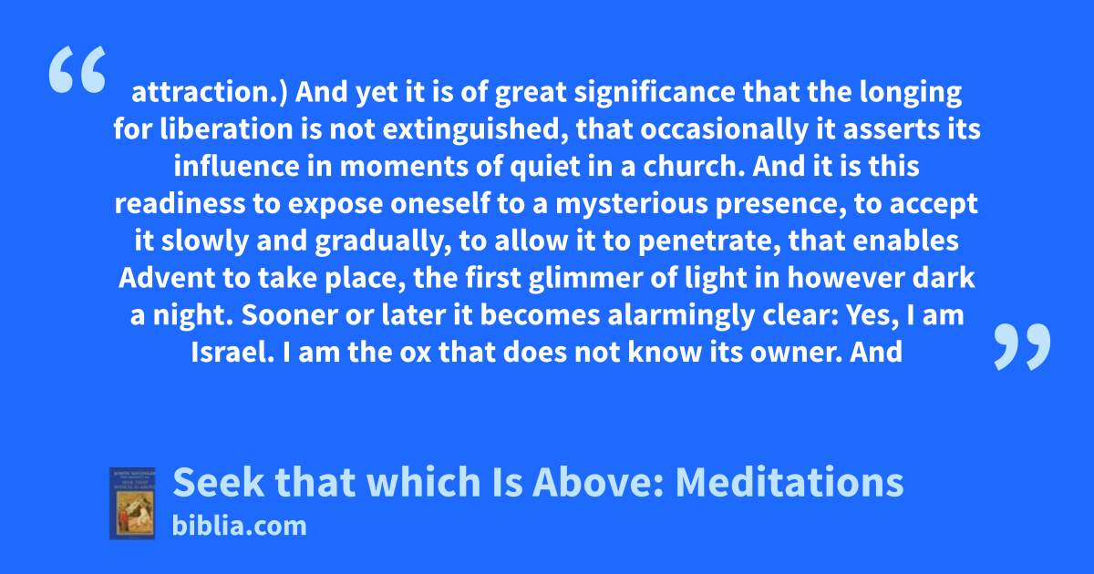 attraction.) And yet it is of great significance that the longing for liberation is not extinguished, that occasionally it asserts its influence in moments of quiet in a church. And it is this readiness to expose oneself to a mysterious presence, to accept it slowly and gradually, to allow it to penetrate, that enables Advent to take place, the first glimmer of light in however dark a night. Sooner or later it becomes alarmingly clear: Yes, I am Israel. I am the ox that does not know its owner. And