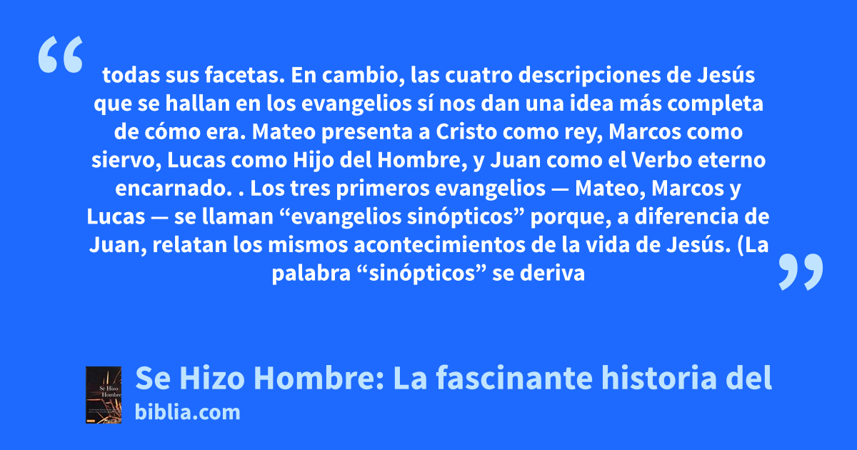 todas sus facetas. En cambio, las cuatro descripciones de Jesús que se hallan en los evangelios sí nos dan una idea más completa de cómo era. Mateo presenta a Cristo como rey, Marcos como siervo, Lucas como Hijo del Hombre, y Juan como el Verbo eterno encarnado. . Los tres primeros evangelios — Mateo, Marcos y Lucas — se llaman “evangelios sinópticos” porque, a diferencia de Juan, relatan los mismos acontecimientos de la vida de Jesús. (La palabra “sinópticos” se deriva