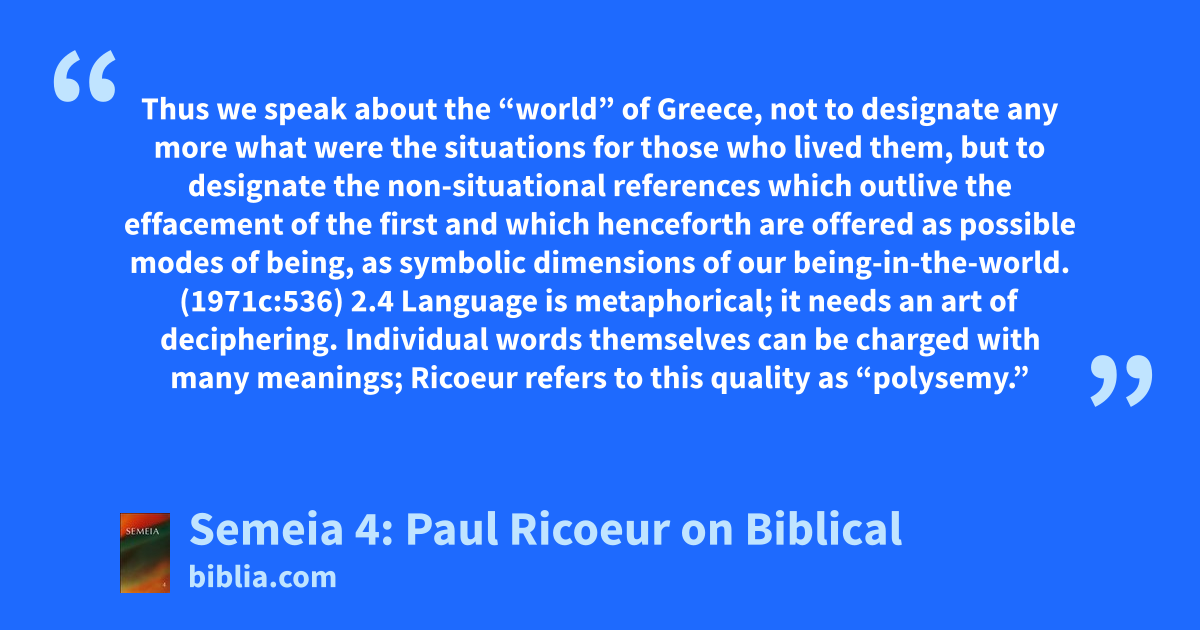Thus we speak about the “world” of Greece, not to designate any more what were the situations for those who lived them, but to designate the non-situational references which outlive the effacement of the first and which henceforth are offered as possible modes of being, as symbolic dimensions of our being-in-the-world. (1971c:536) 2.4 Language is metaphorical; it needs an art of deciphering. Individual words themselves can be charged with many meanings; Ricoeur refers to this quality as “polysemy.”