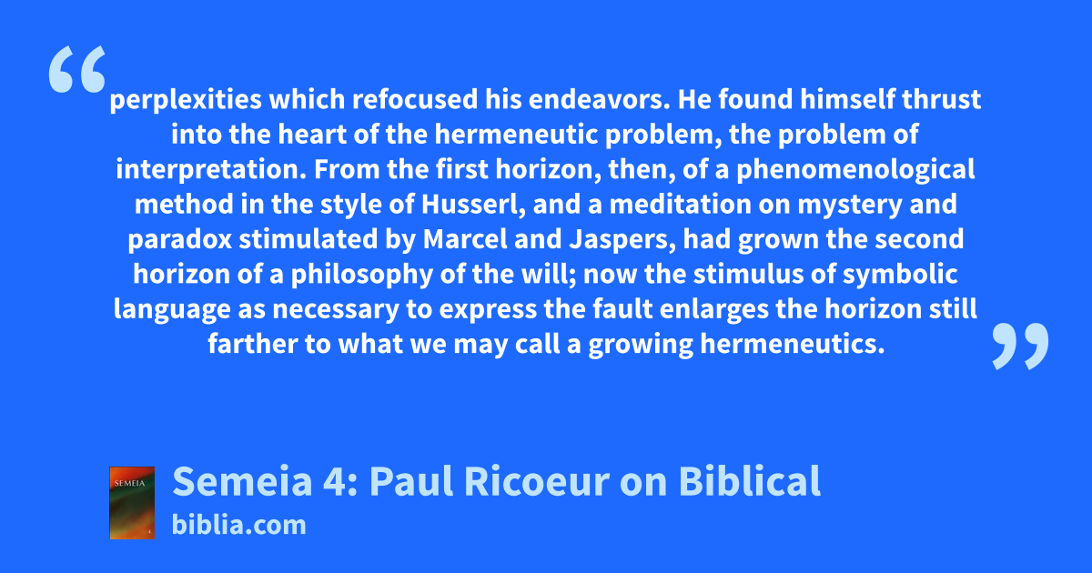 perplexities which refocused his endeavors. He found himself thrust into the heart of the hermeneutic problem, the problem of interpretation. From the first horizon, then, of a phenomenological method in the style of Husserl, and a meditation on mystery and paradox stimulated by Marcel and Jaspers, had grown the second horizon of a philosophy of the will; now the stimulus of symbolic language as necessary to express the fault enlarges the horizon still farther to what we may call a growing hermeneutics.