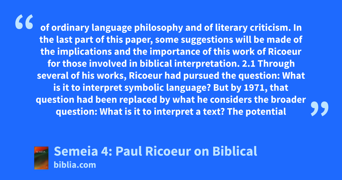 of ordinary language philosophy and of literary criticism. In the last part of this paper, some suggestions will be made of the implications and the importance of this work of Ricoeur for those involved in biblical interpretation. 2.1 Through several of his works, Ricoeur had pursued the question: What is it to interpret symbolic language? But by 1971, that question had been replaced by what he considers the broader question: What is it to interpret a text? The potential