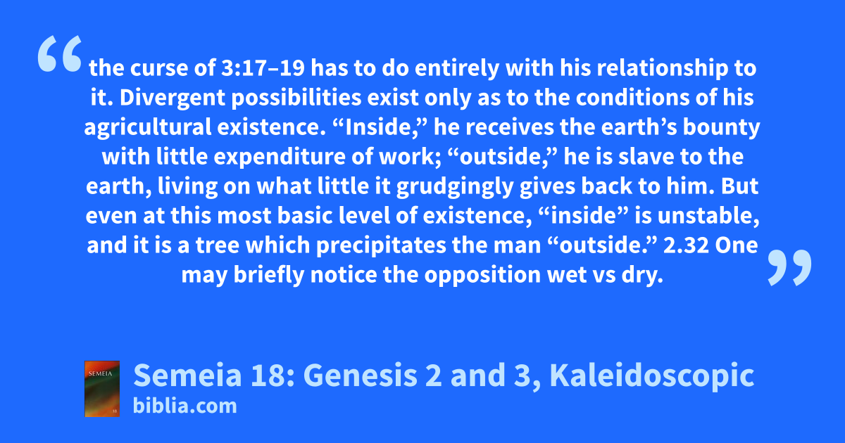 the curse of 3:17–19 has to do entirely with his relationship to it. Divergent possibilities exist only as to the conditions of his agricultural existence. “Inside,” he receives the earth’s bounty with little expenditure of work; “outside,” he is slave to the earth, living on what little it grudgingly gives back to him. But even at this most basic level of existence, “inside” is unstable, and it is a tree which precipitates the man “outside.” 2.32 One may briefly notice the opposition wet vs dry.