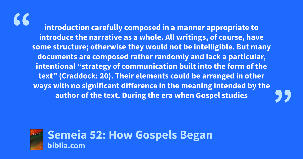 introduction carefully composed in a manner appropriate to introduce the narrative as a whole. All writings, of course, have some structure; otherwise they would not be intelligible. But many documents are composed rather randomly and lack a particular, intentional “strategy of communication built into the form of the text” (Craddock: 20). Their elements could be arranged in other ways with no significant difference in the meaning intended by the author of the text. During the era when Gospel studies