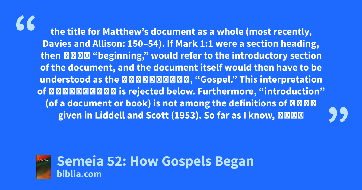 the title for Matthew’s document as a whole (most recently, Davies and Allison: 150–54). If Mark 1:1 were a section heading, then ἀρχή “beginning,” would refer to the introductory section of the document, and the document itself would then have to be understood as the εὐαγγέλιον, “Gospel.” This interpretation of εὐαγγέλιον is rejected below. Furthermore, “introduction” (of a document or book) is not among the definitions of ἀρχή given in Liddell and Scott (1953). So far as I know, ἀρχή