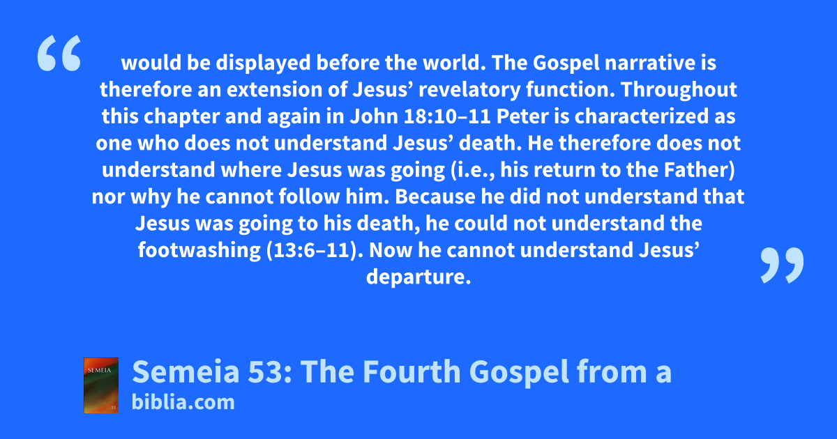 would be displayed before the world. The Gospel narrative is therefore an extension of Jesus’ revelatory function. Throughout this chapter and again in John 18:10–11 Peter is characterized as one who does not understand Jesus’ death. He therefore does not understand where Jesus was going (i.e., his return to the Father) nor why he cannot follow him. Because he did not understand that Jesus was going to his death, he could not understand the footwashing (13:6–11). Now he cannot understand Jesus’ departure.